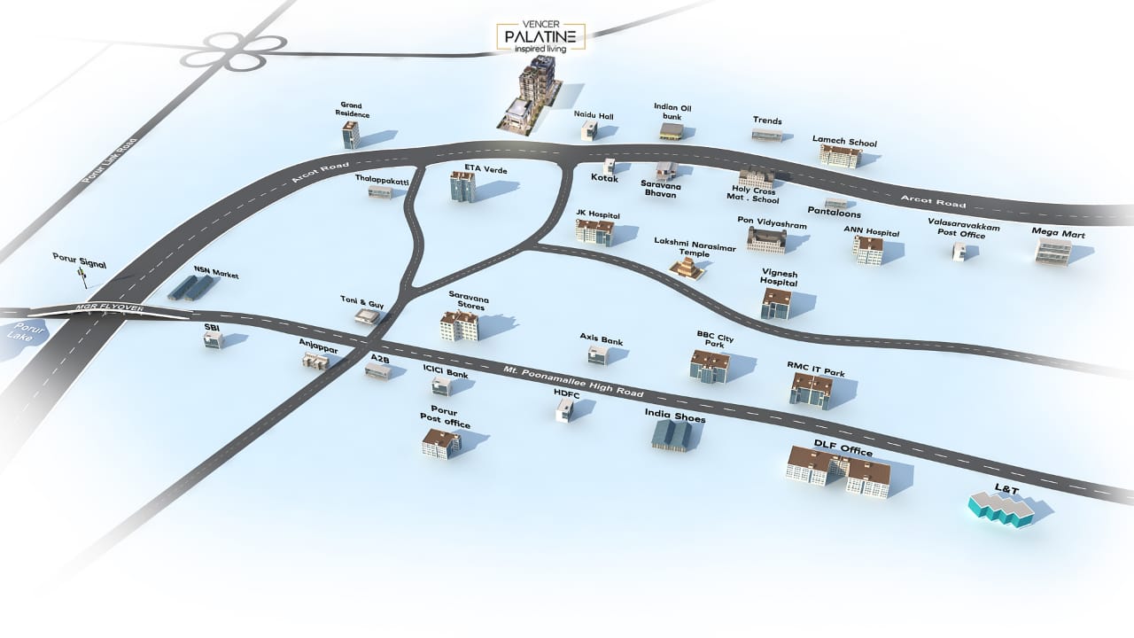 Rising as a new landmark in Chennai, Palatine at Valasaravakkam offers 102 premium apartments in 2 & 3 BHK configurations, each designed to provide open views from three sides. Experience an elevated lifestyle where thoughtful design meets luxury, only at Vencer Palatine.